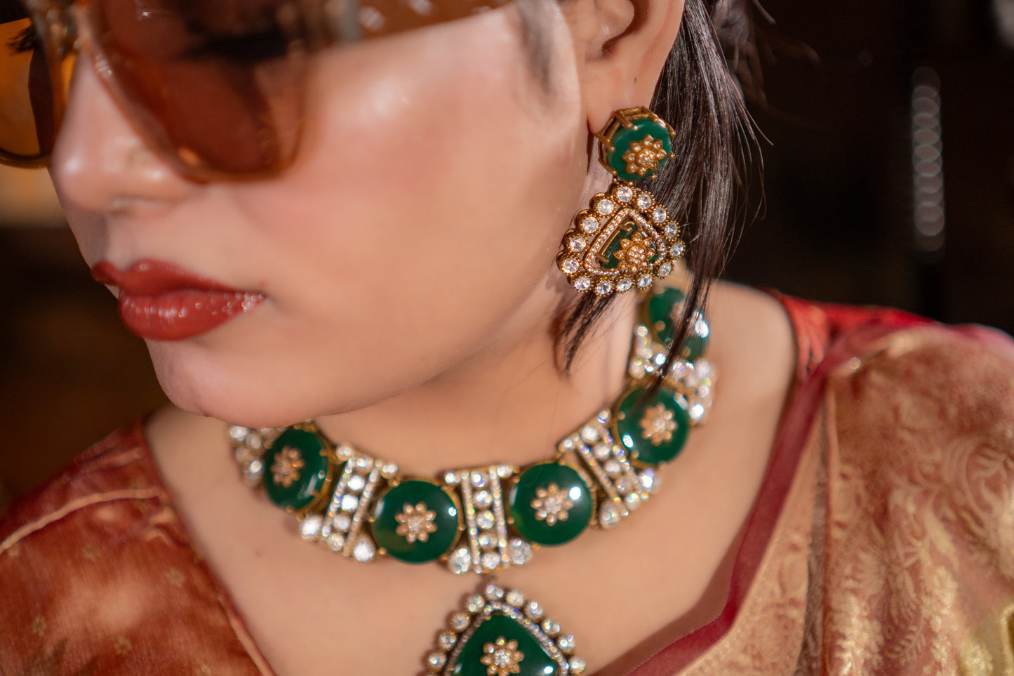 Channel South Indian royalty with the MeowX Tanjore Green Doublet Kundan Necklace Set. Emerald-green doublet stones are meticulously set in 22KT gold-plated Kundan frames, paired with jhumka earrings. A regal heirloom for the traditionalist.