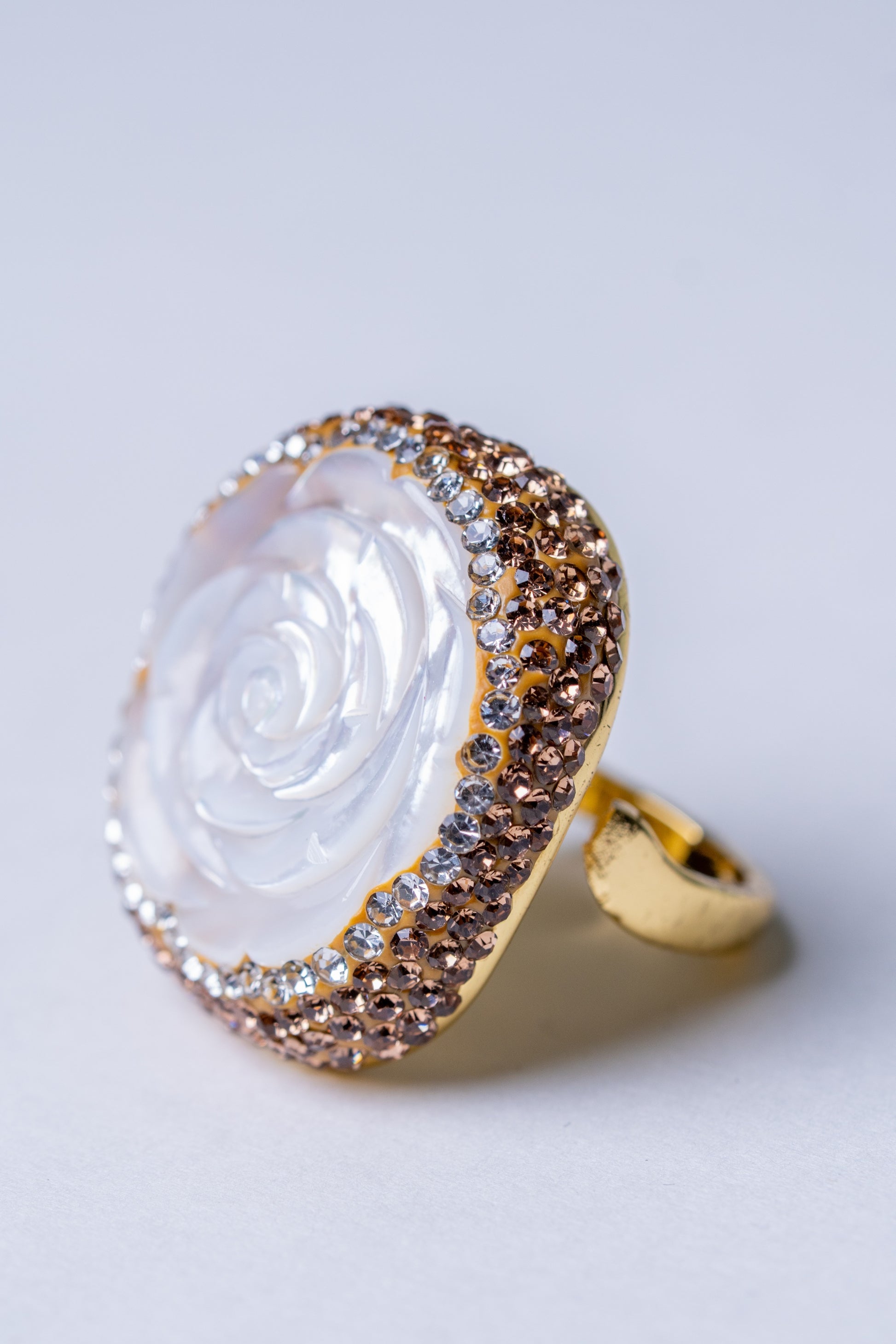 Bloom with artistry in the MeowX Baroque Pearl Floral Carved Ring. Japanese baroque pearls are sculpted into floral motifs, accented by CZ stones on an 18KT gold-plated band. A garden on your finger.