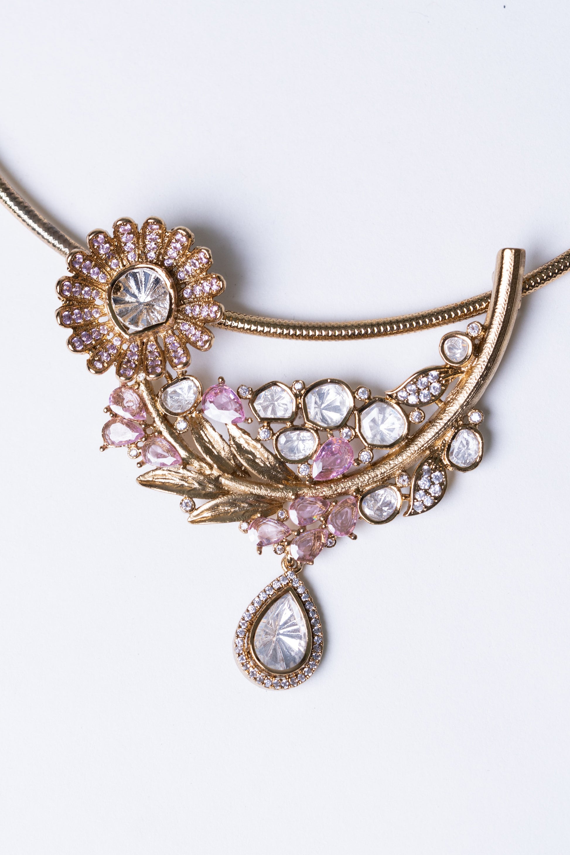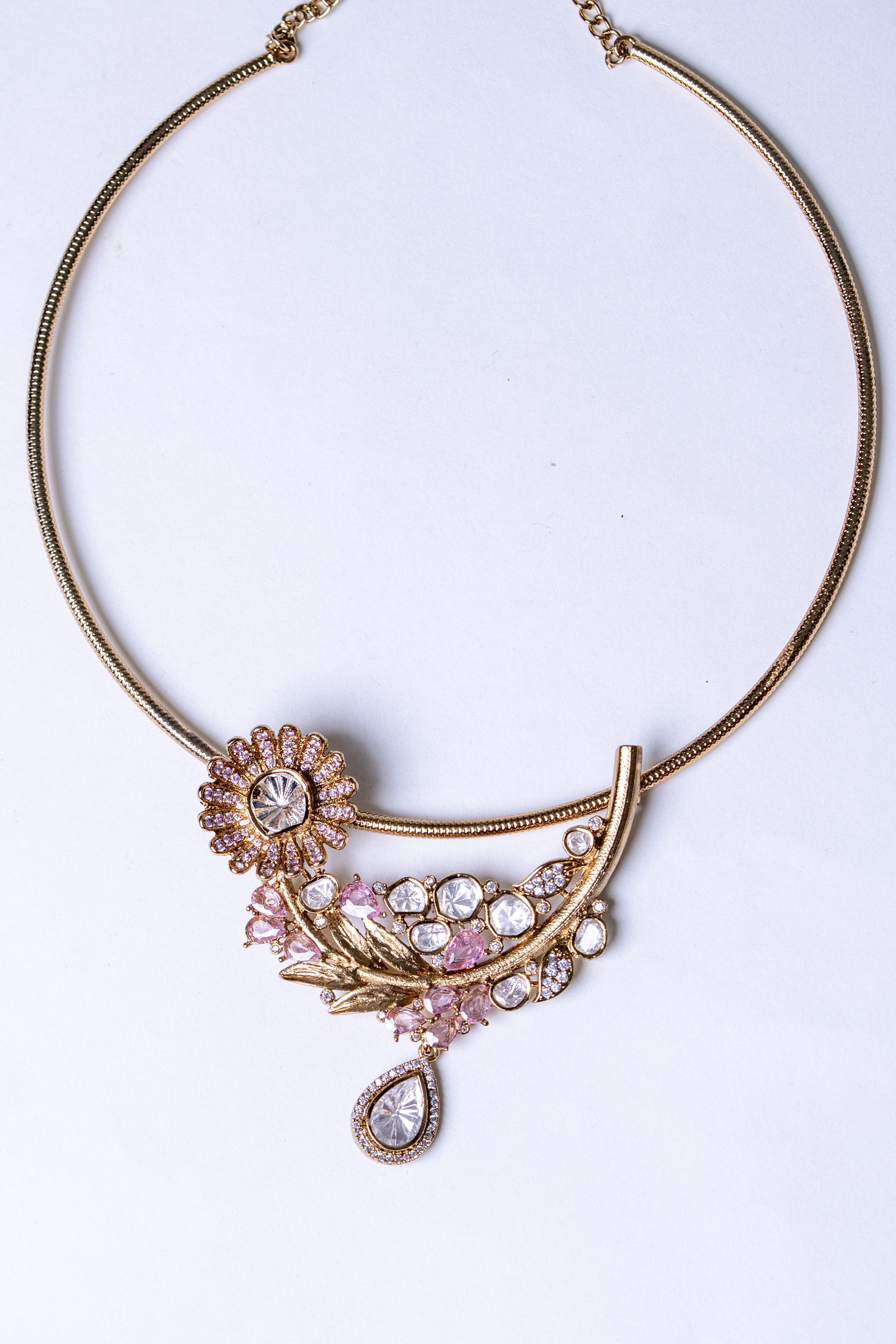 Italian Design with Polki Moissanite and Pink American Diamonds Gold Plated Hasli Necklace