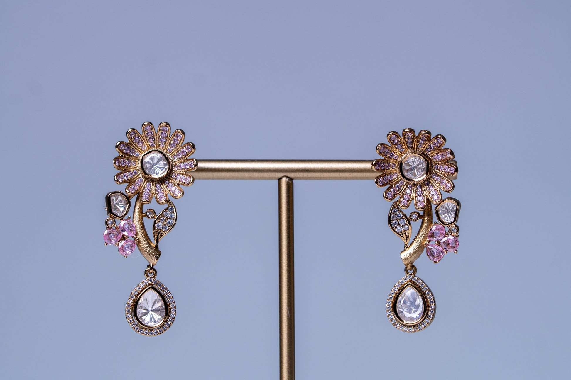 Celebrate Italian romance with the MeowX Italian Pink Gold Plated Hasli Necklace Set. Blush-pink CZ stones and Polki moissanite dance on a 22KT gold-plated hasli, paired with floral earrings. A love letter to Renaissance artistry.