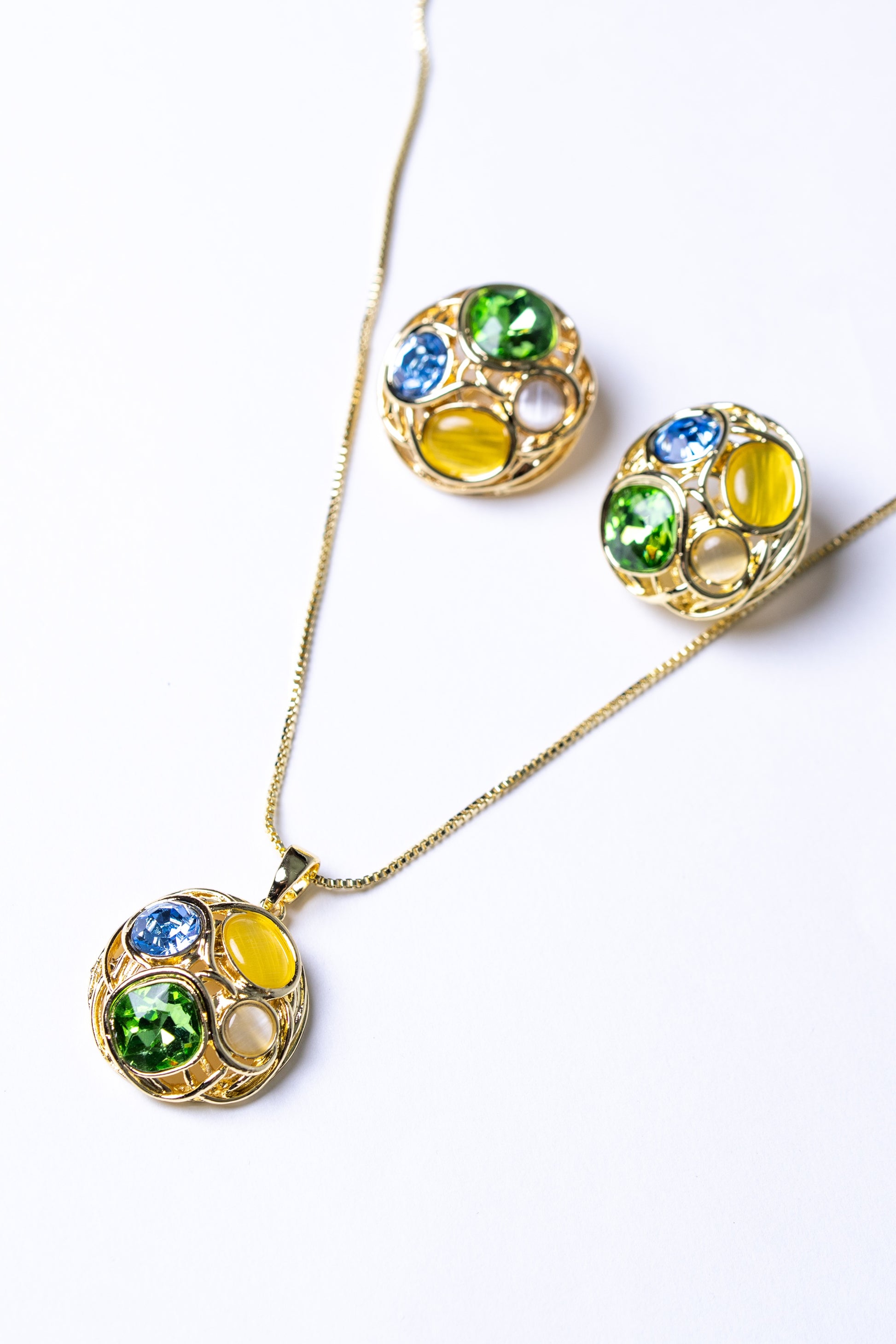 Celebrate life’s vibrancy with the MeowX Multi-Color Australian Crystal Pendant Set. Rainbow-hued Australian crystals, symbolizing diversity, are set alongside CZ stones on an 18KT gold-plated pendant and earrings. For the joyfully eclectic soul.