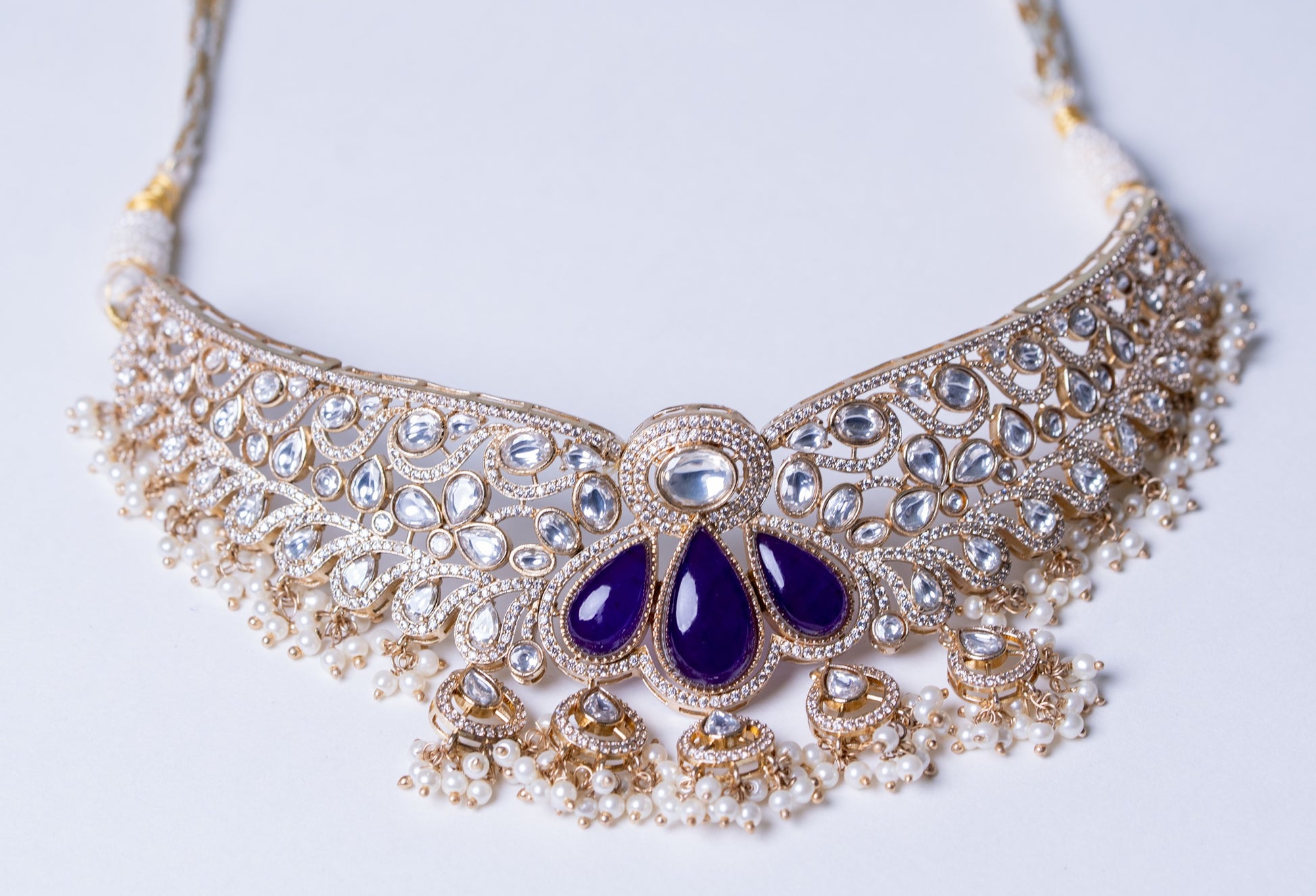 Unveil mystic allure with the MeowX Purple Stone & Moissanite Choker Set. Deep amethyst clusters mingle with moissanite Kundan work on a 22KT gold-plated choker. Paired with teardrop earrings, it’s a tribute to spiritual depth.