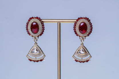 Ignite fiery passion with the MeowX Ruby Stone Polki Moissanite Hasli Necklace Set. Blood-red rubies, set alongside uncut Polki and glittering CZ stones, blaze on a 22KT gold-plated hasli. Paired with chandelier earrings, it’s Mughal opulence reborn.